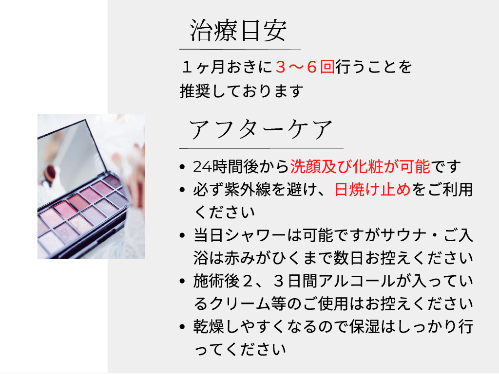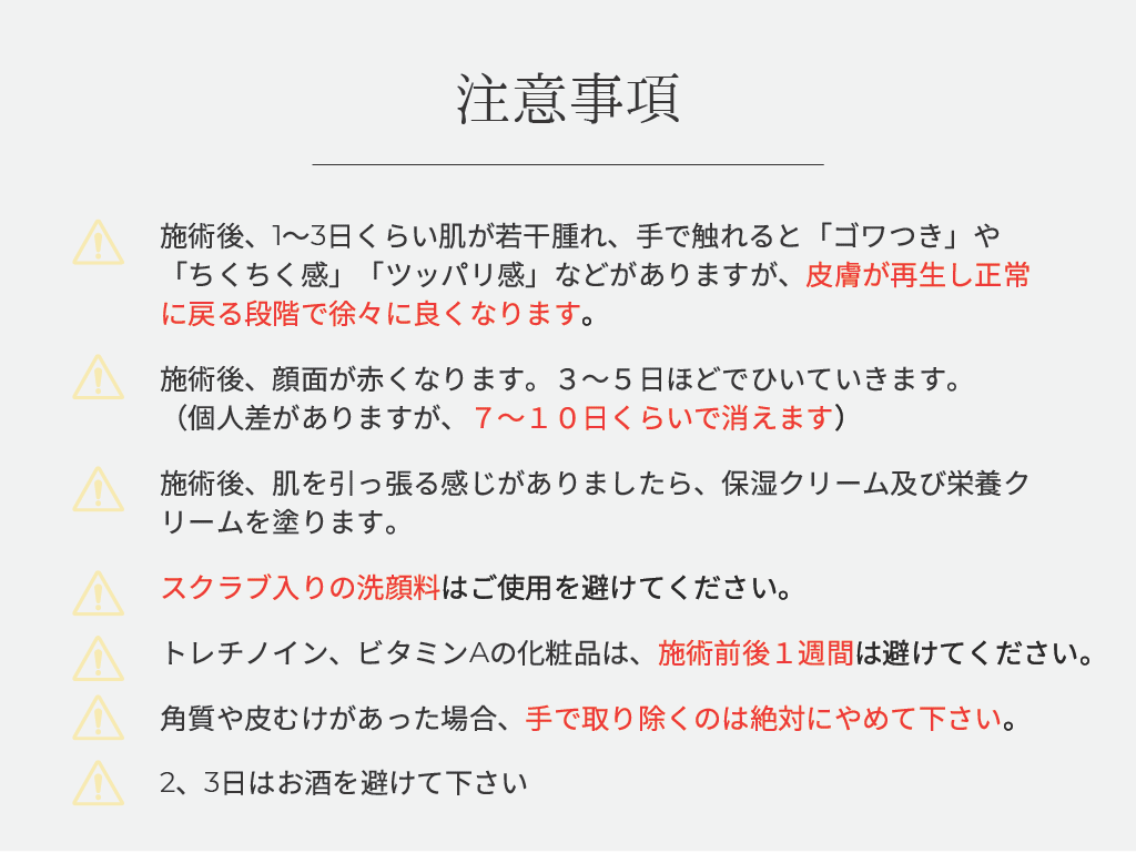 美容施術 ダーマペン 2025.06.06 Tweet Share Hatena Pocket RSS feedly Pin it この記事のタイトルとURLをコピーする 【施術が受けられない方】 キシロカインアレルギーのある方、金属アレルギーの方、皮膚病がある方、感染性疾患がある方、ひどいニキビが進行中の方、出血性の疾患がある方、コントロールできない糖尿合併症及び重大な疾患がある方、妊娠中の方・授乳中の方、ケロイド体質の方、その他疾患の方 【コース契約をご検討される方へ】 コース契約日より起算して8日以内はクーリングオフ期間となるため、コースの消化ができません。コースでの施術をご希望の場合は、施術日の8日前までにご契約ください。 美容施術料金一覧はコチラ» Tweet Share Hatena Pocket RSS feedly Pin it この記事のタイトルとURLをコピーする ジェネシス 前の記事 ウーバーピール 次の記事