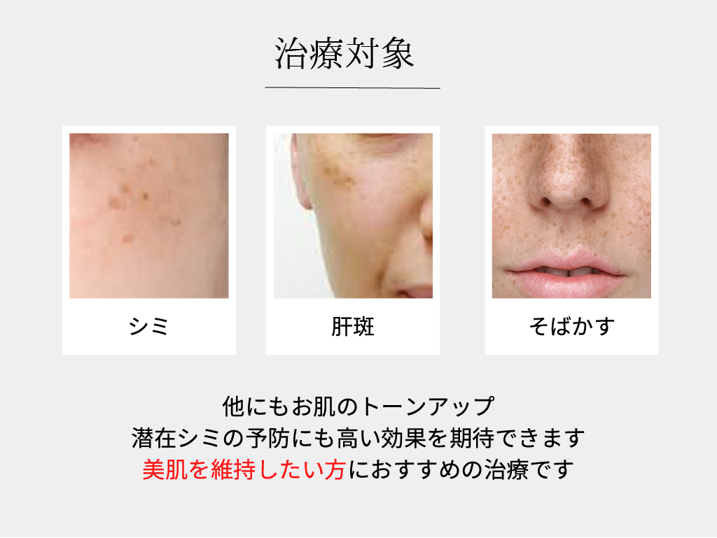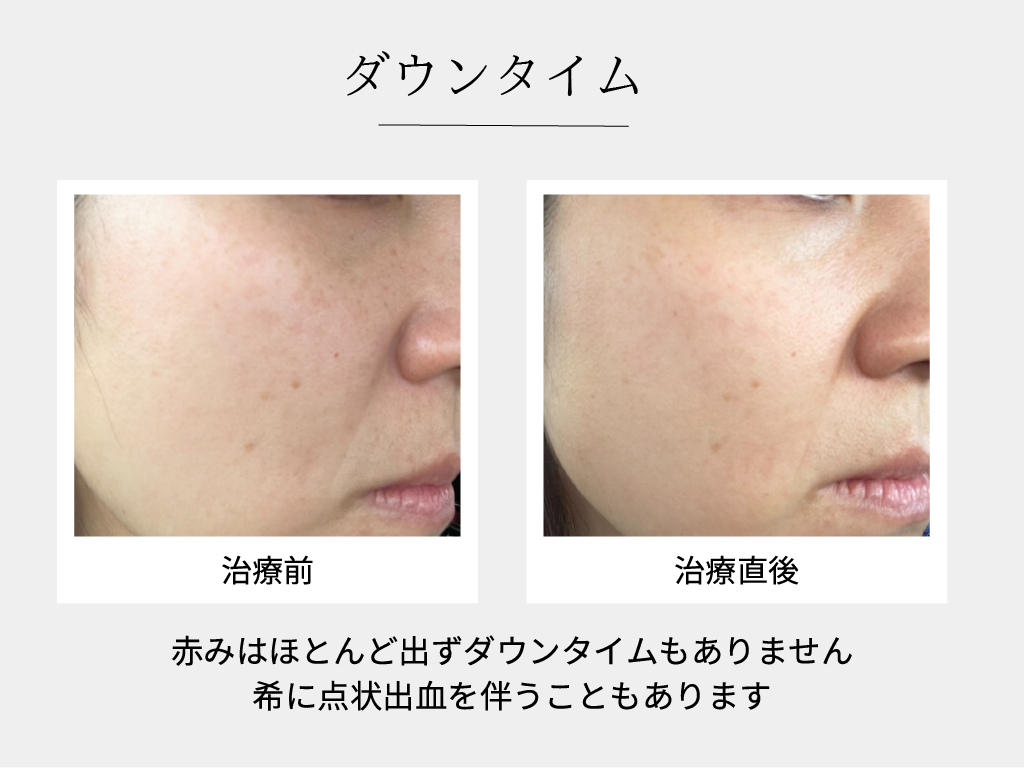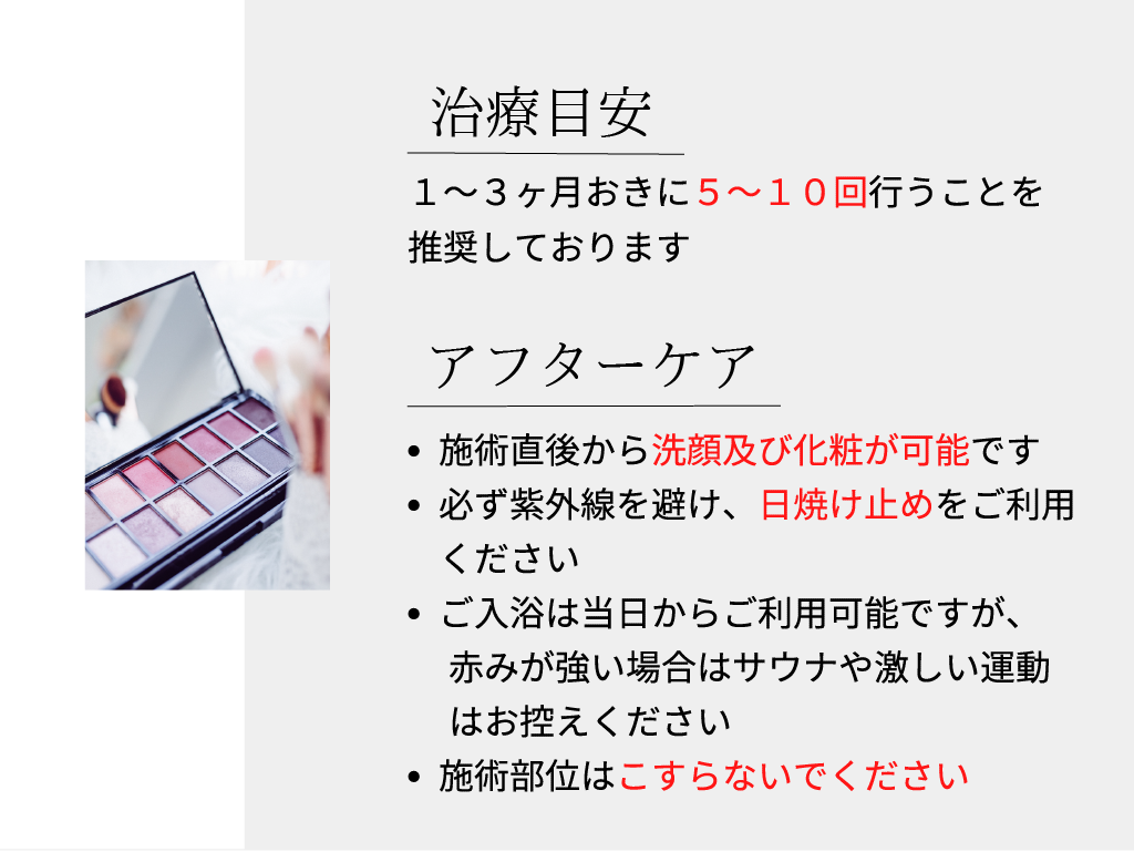 - 照射後、ほてり・赤み・かゆみ・ピリピリ感・一過性の湿疹・にきびのような症状や、熱感・炎症後色素沈着・脱色素斑を起こす可能性も稀にあります